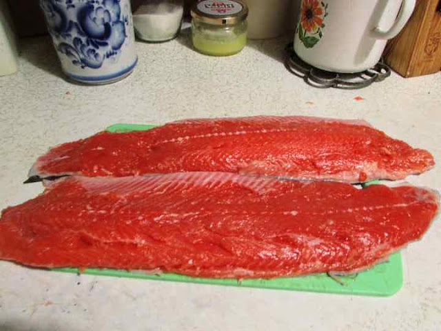 И вот из горбуши делала, но уже с водкой. В принципе: что водка, что виски - особо на вкусе рыбки это никак не отражается. Просто алкоголь держит рыбку в тонусе! Не даёт "расползтись"! :)