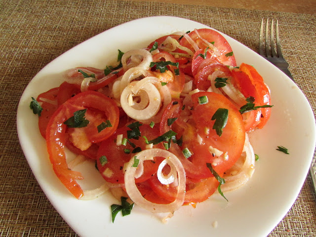 Через время блюдо можно подавать на стол. Я подала закуску с рисом и котлетой (что было на тот момент, так как закуску готовила "на пробу"). Получилось на самом деле очень пикантно и оригинально. И лучше всё же эта закуска подойдёт к шашлыку или люля-кебаб. Этакий маринад "а-ля Грузия". :) Мне так показалось. И всем моим дегустаторам эта закуска очень понравилось - прекрасная альтернатива обычному салату из помидор! Подойдёт и как дополнение к мясному, и как отдельное овощное блюдо.